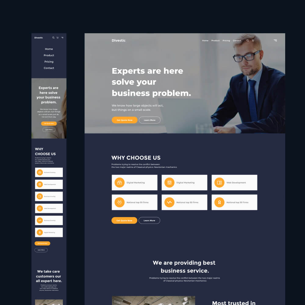Divestic is a sleek and sophisticated Figma corporate dark resources template, tailored for corporate websites. Featuring simple, customizable UI components, Divestic allows you to design modern corporate sites with ease. This lightweight template offers flexibility for creating a professional and polished corporate web presence.